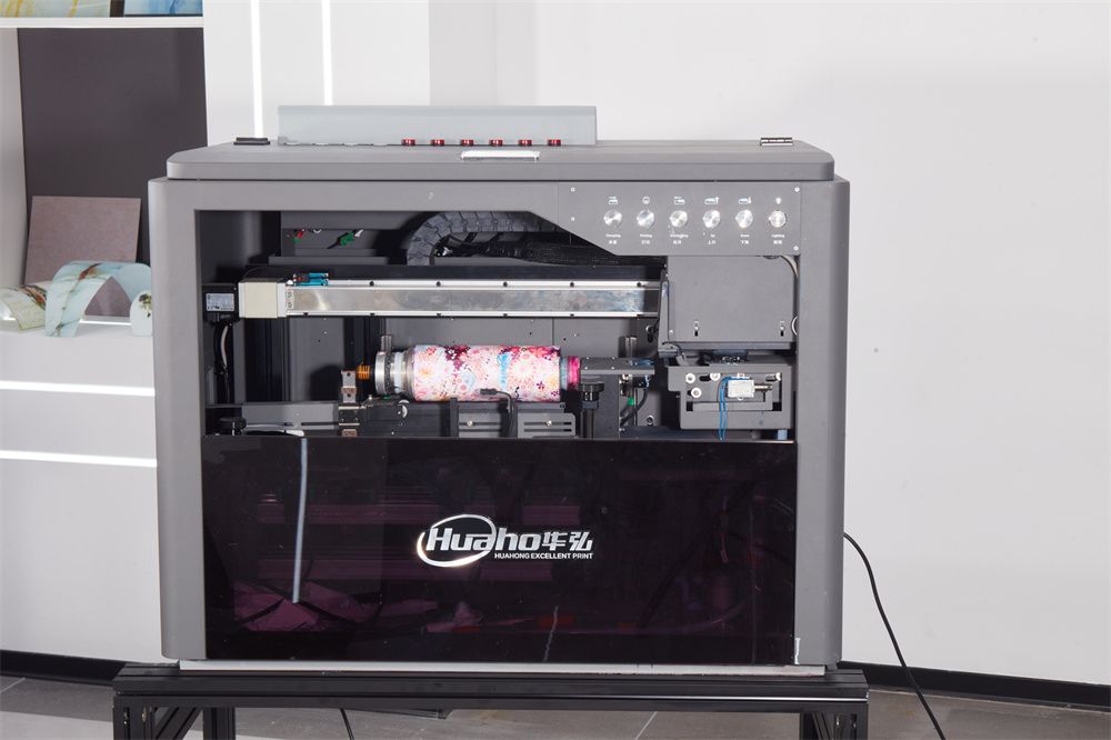 华弘优印新款小型桌面式高速圆柱uv打印机,可以打印白色彩色光油效果,打印最大直径15cm;最大长度27cm;机器尺寸长97cm高87cm宽63cm。